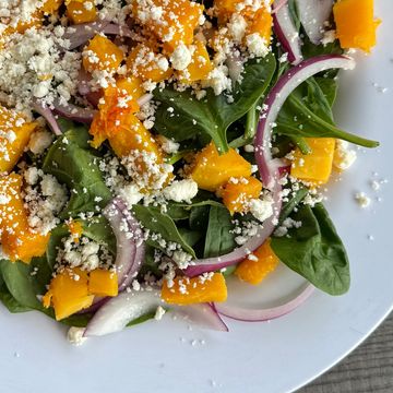 Roasted butternut squash, feta cheese, red onion, over a bed of spinach. Served with your choice dressing of your choice.