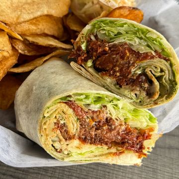 Crispy bacon, lettuce, roasted tomatoes, provolone cheese, and pesto mayo. Served with your choice of French fries or homemade potato chips