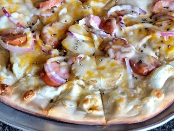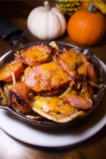 Grilled pierogis, kielbasa and onions baked in the oven with cheddar cheese. Served with a side of sour cream