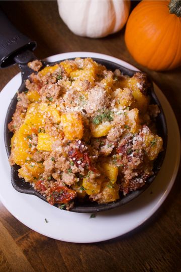 Roasted ground turkey, roasted butternut squash and roasted tomatoes baked in the oven with olive oil and romano cheese